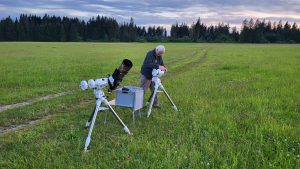 Bereits im September 2022 hatte ich angefangen, im Sternbild Kepheus den Emissionsnebel Sh2-129, den „Fliegende Fledermaus-Nebel“ zu fotografieren. Dieser rote Emissionsnebel aus ionisiertem Wasserstoff (Ha) enthält eine Besonderheit: Bei sehr langen Gesamtbelichtungszeiten erscheint im Fledermausnebel ein zweiter Nebel: Der aus ionisiertem Sauerstoff (OIII) bestehende, bläulich-türkis leuchtende „Tintenfisch-Nebel“, der erst im Jahre 2011 vom Amateur-Astronomen Nicolas Outters entdeckt wurde. Aus den Anfangsbuchstaben des Entdeckers wurde sein Name gebildet: „OU4“. OU4 ist ein äußerst schwach leuchtender Planetarischer Nebel. In diesem Jahr will ich das Projekt „Sh2-129 mit OU4“ abschließen. 13 Nächte investiere ich im August und September. Die aus diesen Nächten verwendbaren Fotos ergeben eine Gesamtbelichtungszeit von mehr als 40 Stunden. Dazu kommen noch die Aufnahmen aus 2022. Das alles ergibt eine Gesamtbelichtungszeit von mehr als 43 Stunden! Trotzdem ist es eine Herausforderung an die Astro-Fotografie-Bildbearbeitung, den äußerst schwachen Nebel im viel, viel stärker leuchtenden Fledermaus-Nebel sichtbar zu machen.