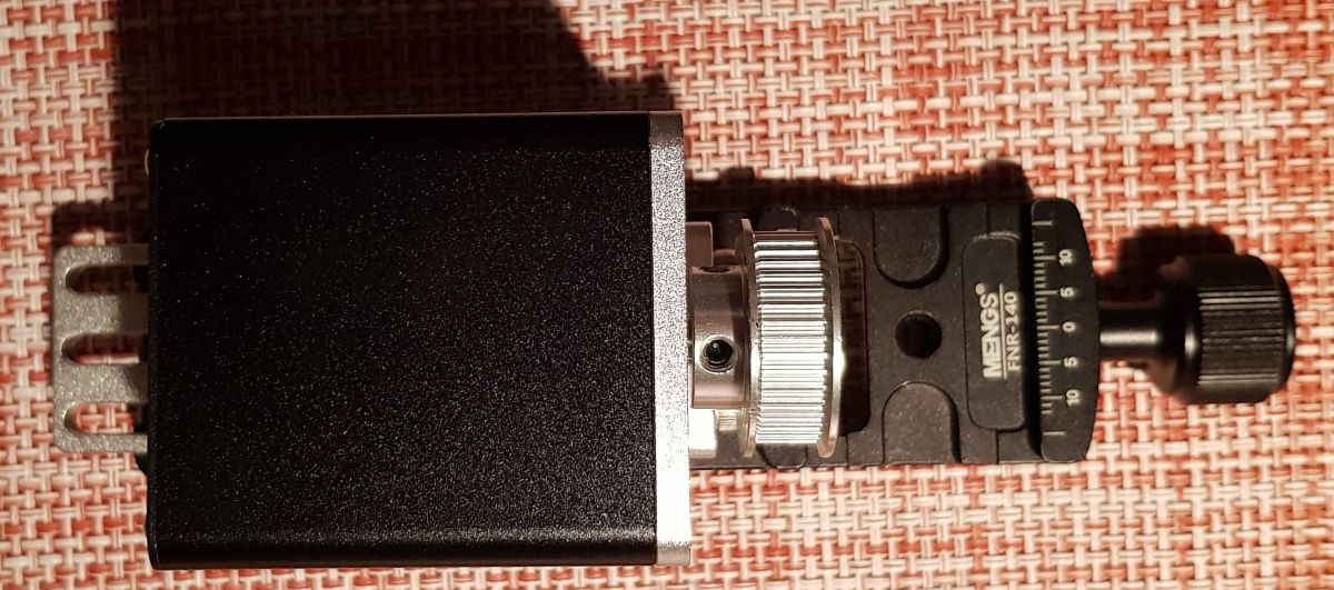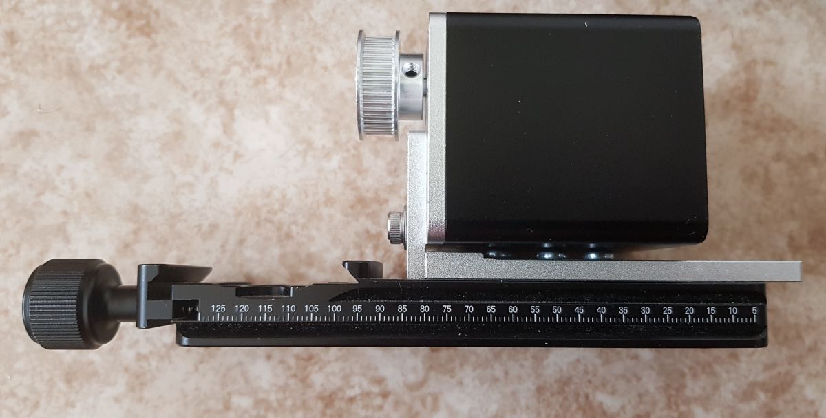 Der mit der Zahnriemenscheibe montertie EAF wird auf die Arca-Swiss-kompatible Nodal-/ Makroschiene 150 mm (oder die 180mm Doppelschiene)