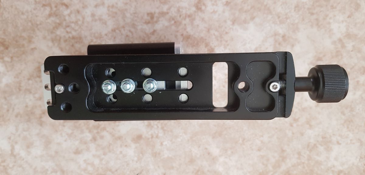 Weil ich die Optik auf meinen EQ6-R-Montierungen ausbalancieren muss, ist das Verschieben der Kamera-/Objektiveinheit in der Y-Achse oft notwendig. Dazu ist ein Objektivring (oder Ring an der Astro-Kamera) mit Arca-Swiss-Schuh notwendig. Auf der Montageplatte eine entsprechende Arca-Swiss-Klemme.