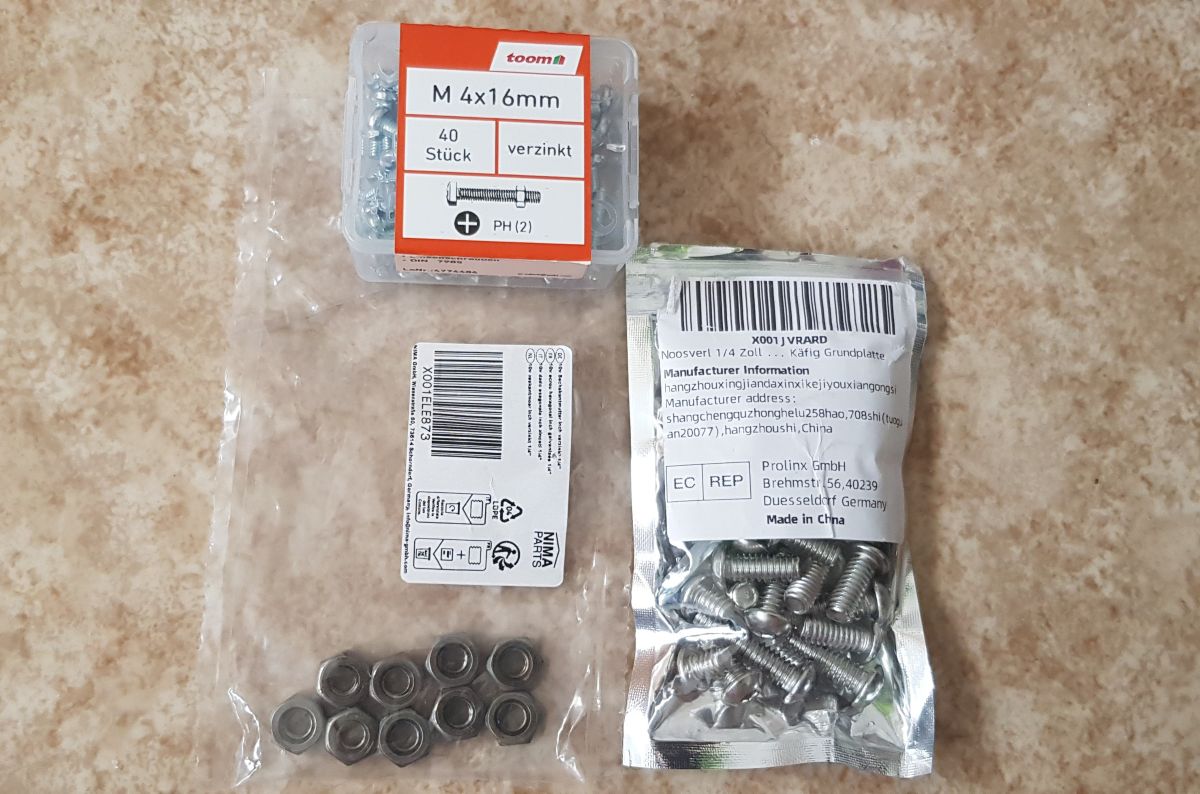 4x16mm Schrauben aus dem Baumarkt mit Muttern und Unterlegscheiben