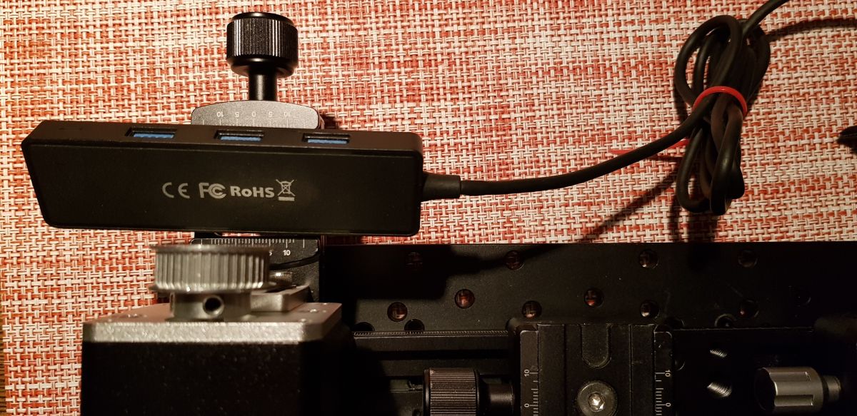 geschraubt, die anschließend wiederum auf eine der Doppelklemmen befestigt wird. In die Klemme der Nodal-/Makro-Schiene habe ich noch einen USB 3.x-Hub geklemmt.