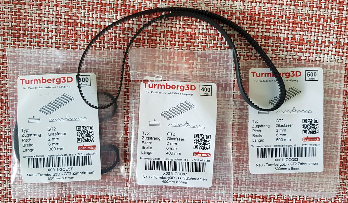 Turmberg3D GT2 geschlossener Zahnriemen – 6mm breit – Länge 500mm – je 2 Stück – Zugstrang aus Glasfaser (500mm) bzw. Turmberg3D GT2 geschlossener Zahnriemen – 6mm breit – Länge 400mm – je 2 Stück – Zugstrang aus Glasfaser (400mm) (z.B. bei Amazon)