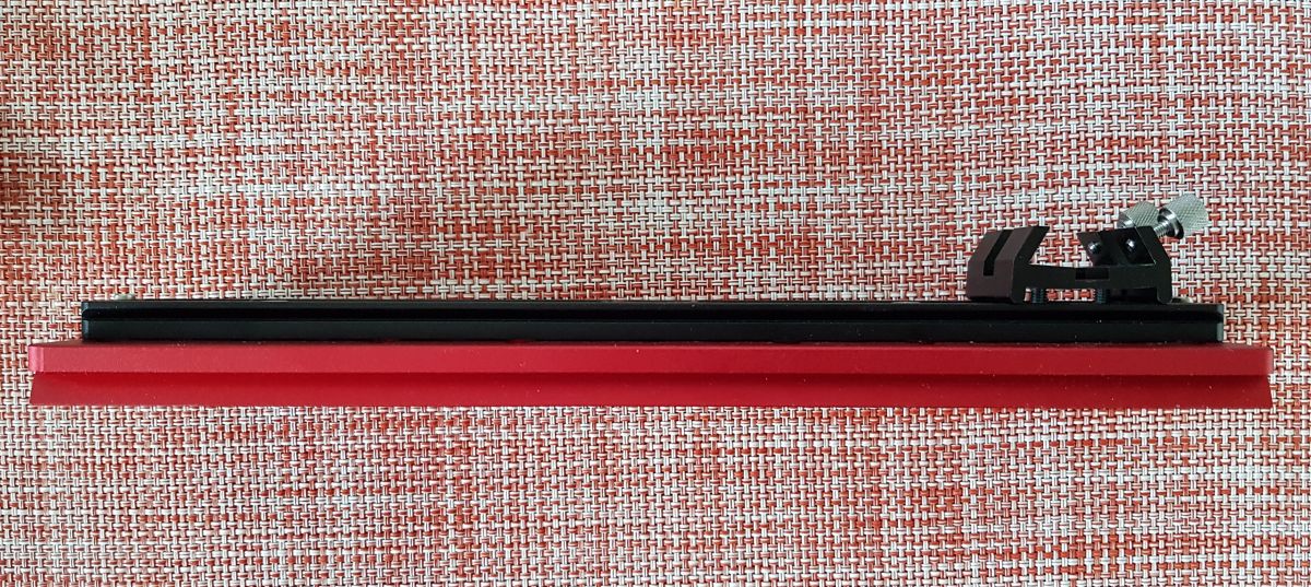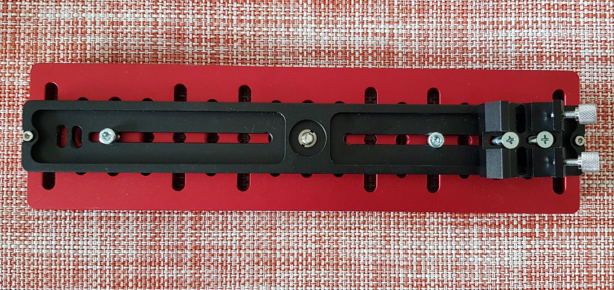 Obige Schiene für die Montage des EAF an DSLR-Objektiven. Die Doppelklemme mit der Kameraplatte (mit obiger 180mm-Version mitgeliefert) wird für das Guidescope verwendet, indem auf die Kameraplatte die Guidescopeklemme montiert und die ganze Einheit auf die 350mm/400mm/300mm-Schiene geklemmt wird.