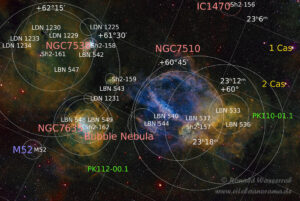 Den Blasen-Nebel NGC7635 hatte ich übrigens bereits zwei Jahre zuvor schon einmal abgelichtet (siehe: Astro-Fotografie – Objekte des Sommerhimmels 2023). Im vorgenannten Bericht sind noch weitere, sehr interessante Objekte zu bestaunen. Z.B. die berühmten „Säulen der Schöpfung“, die „Fliegende Fledermaus“ mit dem „Tintenfisch-Nebel“, den „Löwen-Nebel“ usw.