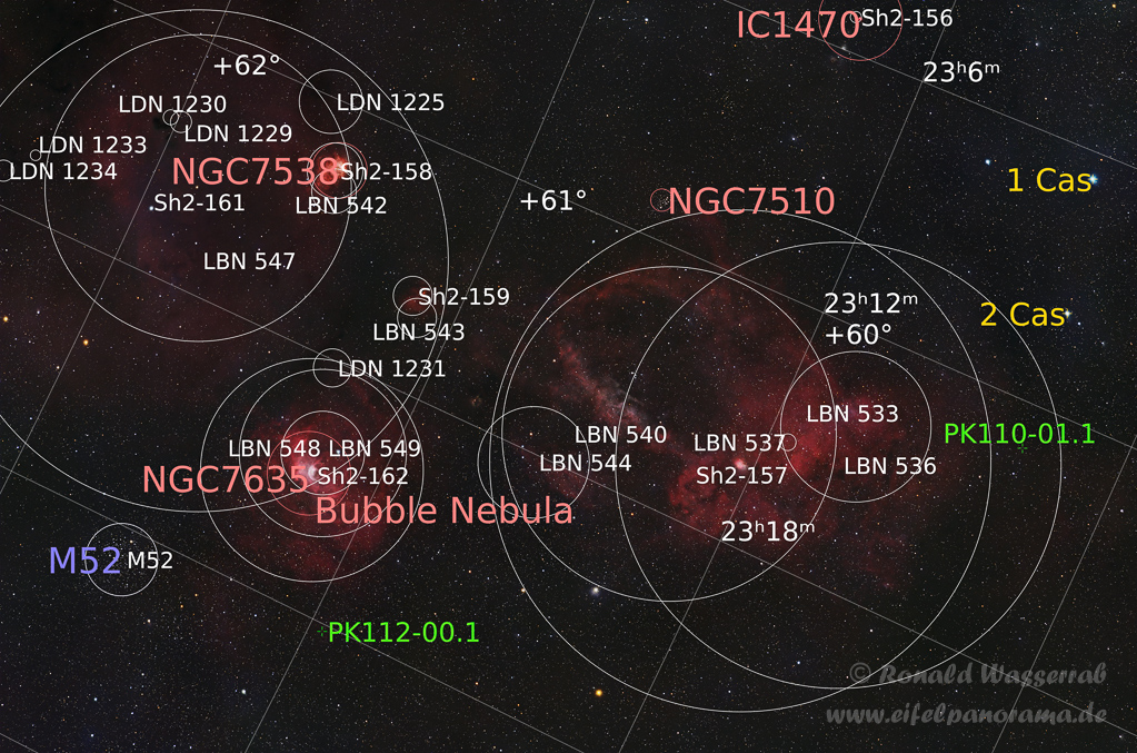 Sh2-157 konnte ich im Sommer 2025 im Südschwarzwald an 4 Nächten aufnehmen. Verwendet habe ich mein Canon-Zoom-Objektiv bei Brennweite 400mm. Mit dieser Brennweite war es möglich, nicht nur den Hummerscheren-Nebel, sondern auch den Blasen-Nebel NGC 7635 und den offenen Sternhaufen M52 mit in den Bildausschnitt nehmen.