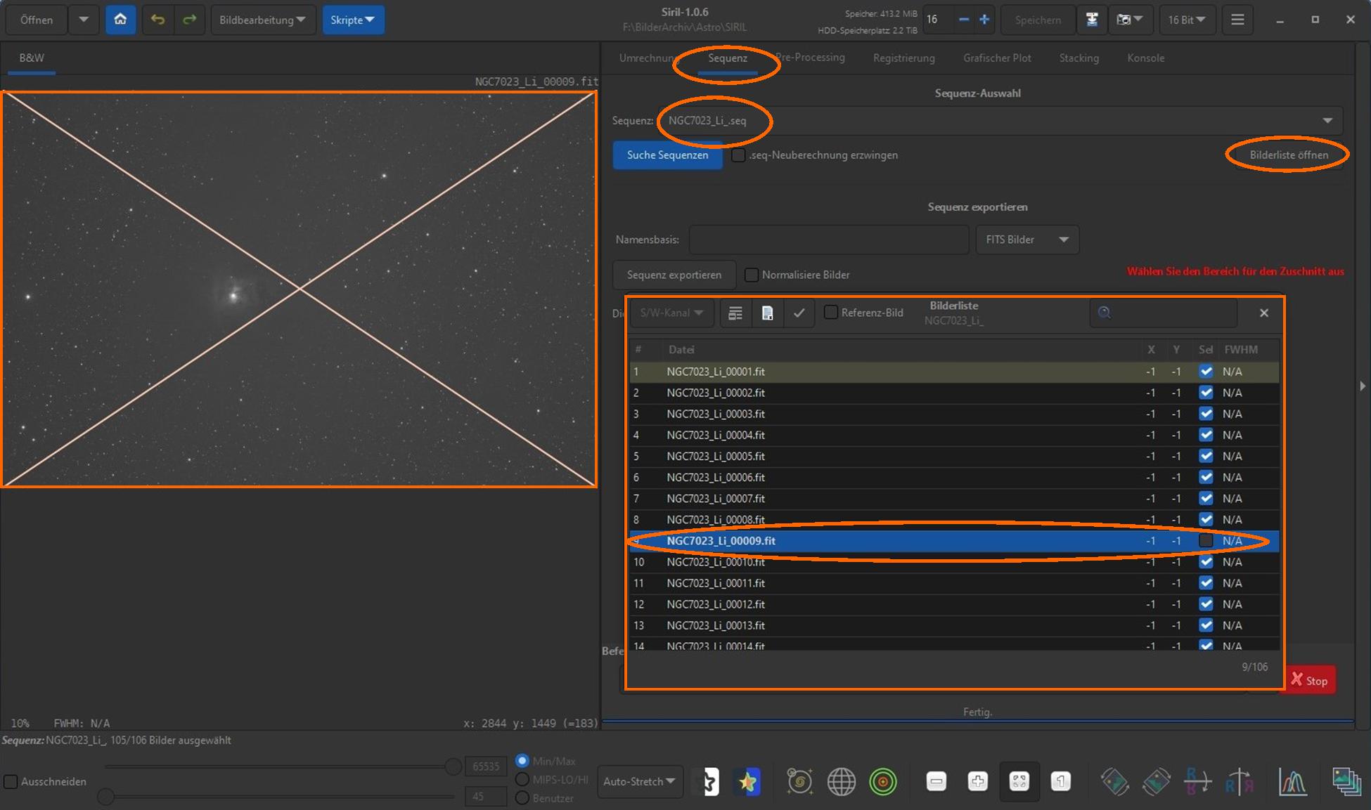 SIRIL-Stacking mit Sequenzen – Lights per Bilderliste überprüfen