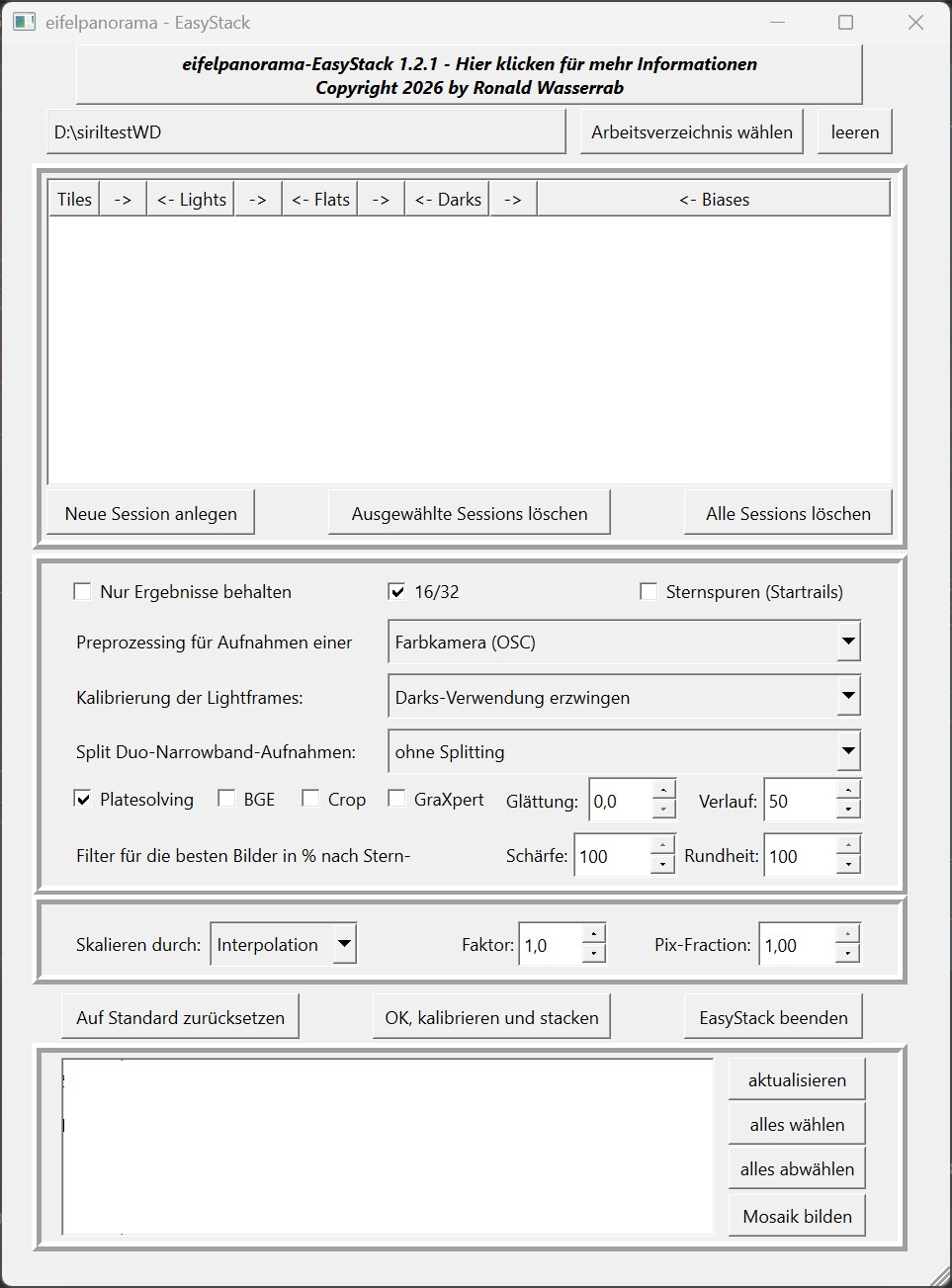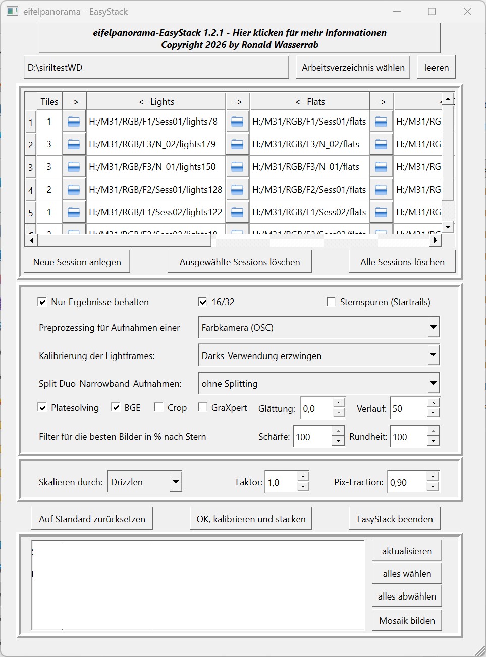 Ab der Version 1.2.1 können Mosaike gestackt und zusammengesetzt werden. Dazu wurde die Sessions-Liste um die Spalte „Tiles“ (Kacheln) erweitert. Sessions mit gleicher Nummer unter „Tiles“ werden gemeinsam gestackt und das Ergebnis im „result“-Verzeichnis der Kachel (T..) gespeichert.
