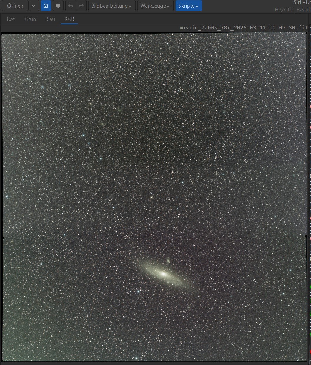 Mit Python-Skript „EasyStack“  für Siril ab Version 1.4 werden die allermeisten der zahlreichen alten eifelpanorama- und viele der alten Siril-Skripte überflüssig, denn sie wurden mit „EasyStack“ in einem einzigen Skript zusammengefasst. Dabei habe ich die Gelegenheit genutzt, weitere Vereinfachungen zu implementieren. Insbesondere beim Preprocessing von Multinight-Aufnahmen, beim Trennen von Duo-Narrowband-Aufnahmen in Hα/SII und OIII, sowie beim neu in Siril zur Verfügung stehenden echten Drizzlen. Und im neuen EasyStack 1.2 habe ich u.a. Mosaik-Stacking hinzugefügt.