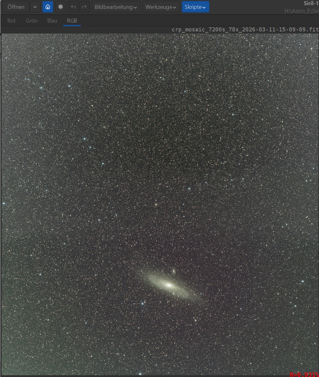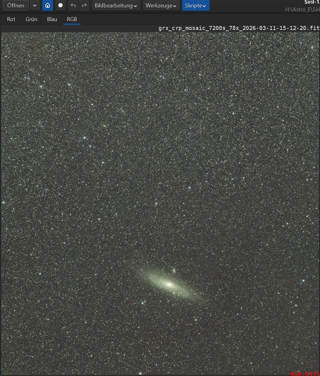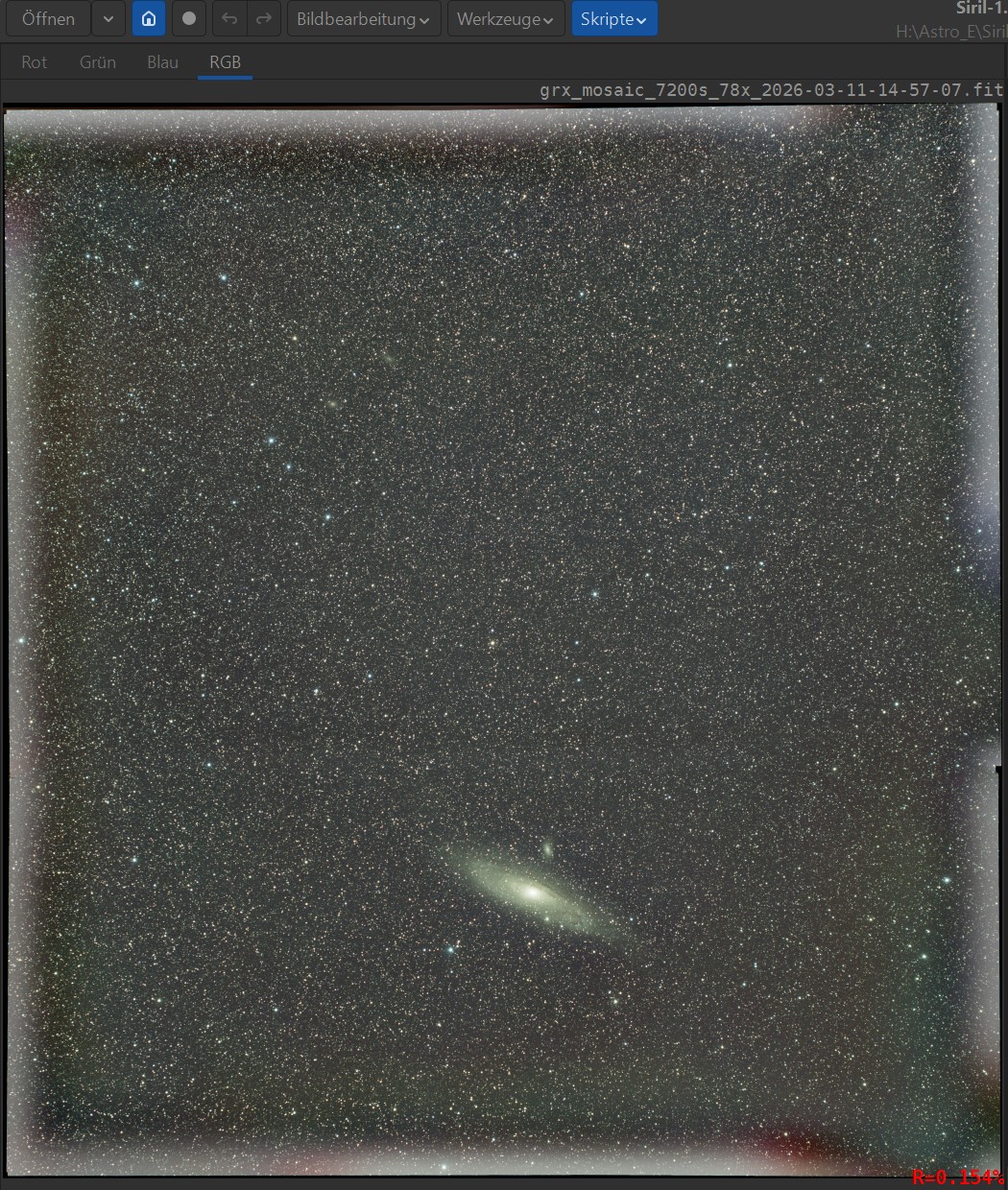 Durch das Zusammenfügen der Mosaik-Kacheln können Mosaike entstehen, die größer sind, als die Siril-Grenze für bearbeitbare Bilder. Diese Grenze liegt derzeit (Siril-Version 1.4.2) bei einer maximalen Kantenlänge von 32.768 Pixeln. Größere Bilder müssen entweder mit anderen Programmen bearbeitet, oder verkleinert werden. Die Verkleinerung erfordert einen neuen Mosaik-Lauf mit entsprechendem Skalierungs-Faktor < 1 (z.B. 0.75 oder 0.5). Beim Zusammenfügen der Mosaikteile wird das Drizzlen ignoriert und stattdessen interpoliert. Es wird der unter „Faktor“ eingetragene Vergrößerungs-/Verkleinerungsfaktor verwendet.
