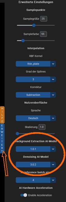 Bitte nach der Installation GraXpert aufrufen und über „Erweitert“ prüfen, ob die AI-Modelle für das Entrauschen und die Gradientenentfernung verfügbar sind. Wenn nicht, bitte ein beliebiges Astrobild in GraXpert laden und Gradienten, sowie Entrauschen per AI aufrufen, damit die Modelle installiert werden.