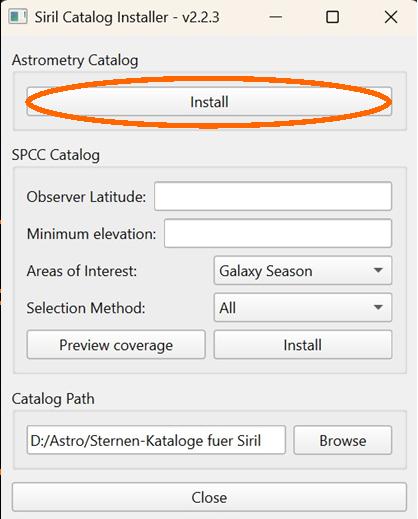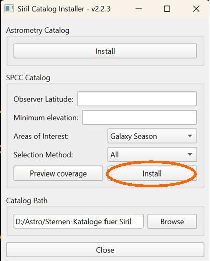 Beim Erscheinen der üblichen Siril-Skript-Warnung auf „Skript ausführen“ klicken. Es erscheint das Fenster des Katalog-Installers.