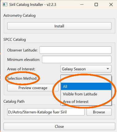 Um Speicherplatz zu sparen bzw. nur die Daten einer bestimmten Region zu laden, kann unter „Areas of Interest“ zwischen verschiedenen Optionen gewählt werden. Sollen diese Einschränkungen gültig werden, muss unter „Selection-Method“ ebenfalls „Areas of Interest“ gewählt werden. Falls zu einem späteren Zeitpunkt die Daten weiterer Regionen gewünscht sind, kann der Catalog-Installer erneut aufgerufen und die erforderlichen Daten nachgeladen werden. Die Selection-Method „Visible from Latitude“ schränkt das Gaia-Daten-Volumen auf die Objekte ein, die unter „Observer Latitude“ und „Minimum elevation“ sichtbar sind.