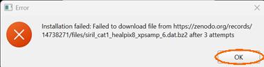 Nun klicken wir auf die Install-Schaltfläche des SPCC-/Gaia-Catalogs. Leider erhalte ich (Stand Ende 2025) beim Download über den Catalog-Installer Fehlermeldungen. Die insgesamt 48 Dateien können aber auch von der folgenden Website manuell geladen werden: Siril Spectrophotometric Catalog extracted from Gaia DR3. Erfolgreich durch den Catalog-Installer heruntergeladene Dateien werden automatisch entpackt. Manuell heruntergeladene Dateien müssen selbst entpackt werden.