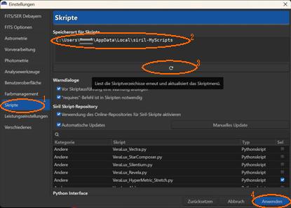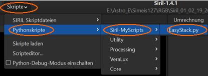 Die Skripte werden in ein eigenes Verzeichnis kopiert (z.B. in das Verzeichnis „C:\Users\Username\AppData\Local\siril-MyScripts“), welches natürlich vorher angelegt werden muss. Anschließend wird der Verzeichnisname im Einstellungen-Fenster für Skripte unter „Speicherort für Skripte“ eingetragen. Durch Klick auf den Button darunter (der Button mit dem Kringel) werden die im Verzeichnis vorhandenen Skripte im Skripte-Menü unter „Pythonskripte“ bzw. „SIRIL Skriptdateien“ zur Verfügung gestellt.