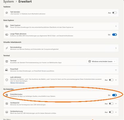 Um den Entwicklermodus in Windows 11 einzuschalten, öffnest du das Start-Menü und wählst dort „Einstellungen“. Dann öffnest du das Menü „System“ und dort „Erweitert“. Im nun erscheinenden Fenster wählst du „Für Entwickler“ und stellst dann den Schalter „Entwicklermodus“ auf „Ein“. Die anschließende Nachfrage bestätigst du mit „Ja“.