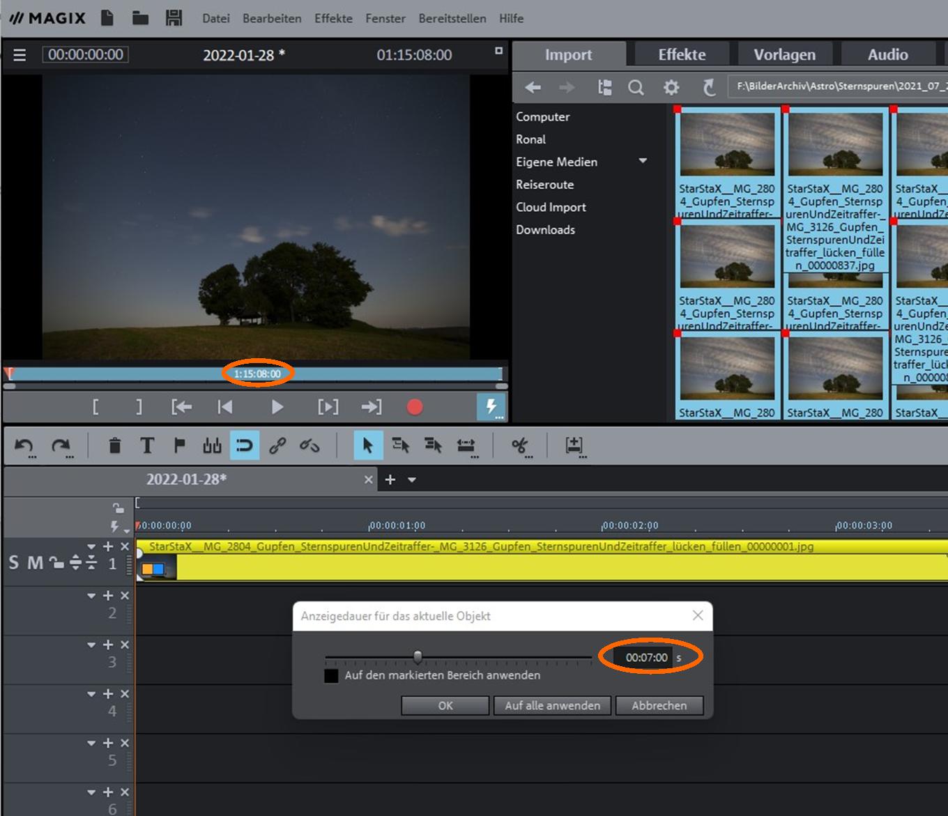 Die einzelne Länge aller Fotos muss für das Zeitraffer-Video mit Magix Video deLuxe entsprechend verkürzt werden: Von 00:07:00 Sekunden auf 00:00:01 Sekunden.