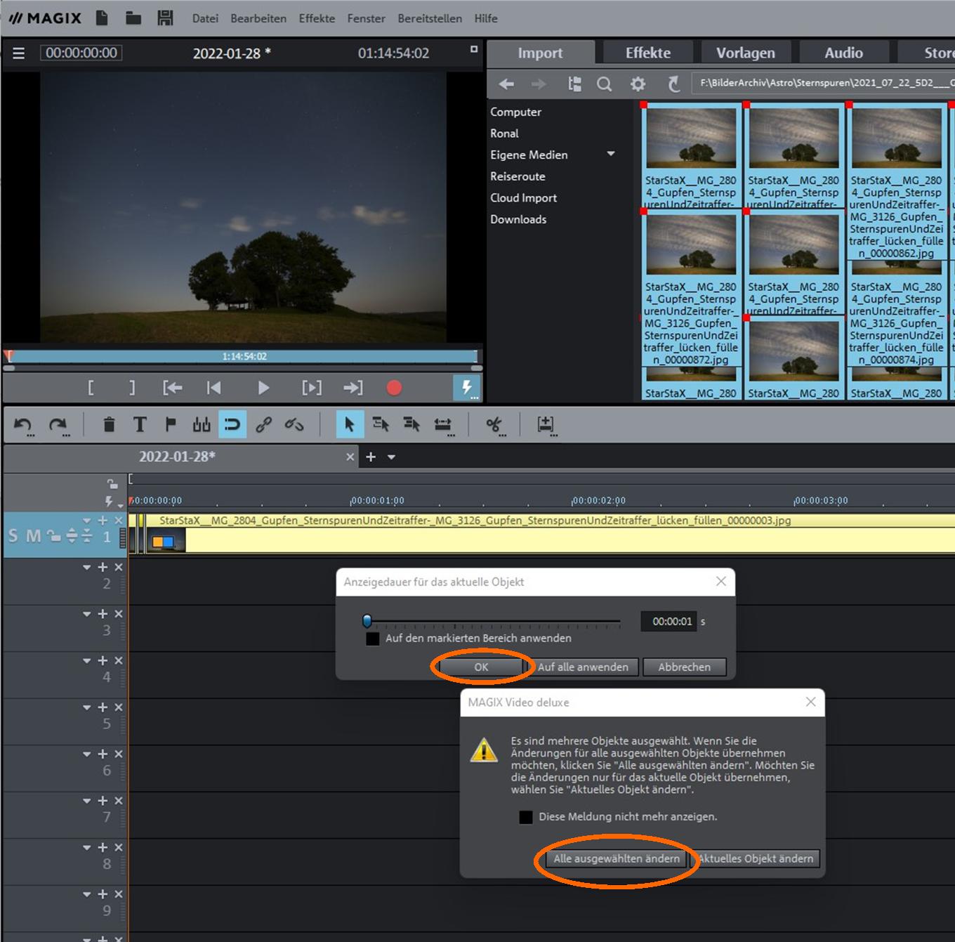Für das Zeitraffer-Video mit Magix Video deLuxe werden die im Bericht „Sternspuren-Zeitraffer erstellen“ angefertigten 644 Frames (Fotos) zuerst per „Drag and Drop“ in das Videoschnittprogramm importiert.
