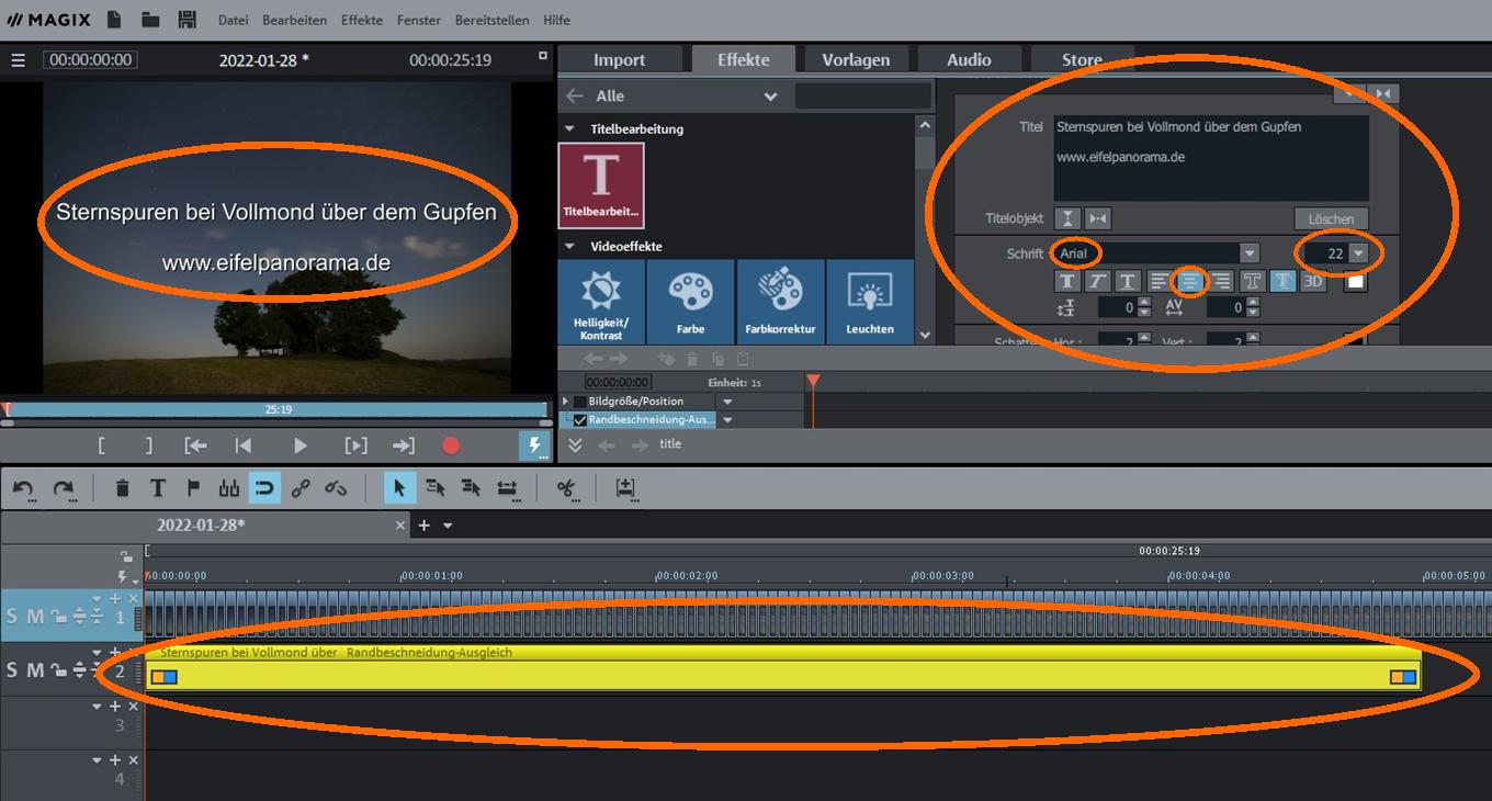 Der Titel soll die sich aufbauenden Sternspuren nicht stören/überdecken. Deshalb markieren wir das erste Foto und passen es an die Länge des Titels an. Durch einen Probelauf kann die Titellänge getestet und ggf. angepasst werden. Eine längenmäßige Anpassung ist dann ggf. auch für das zugehörige erste Foto noch einmal notwendig.