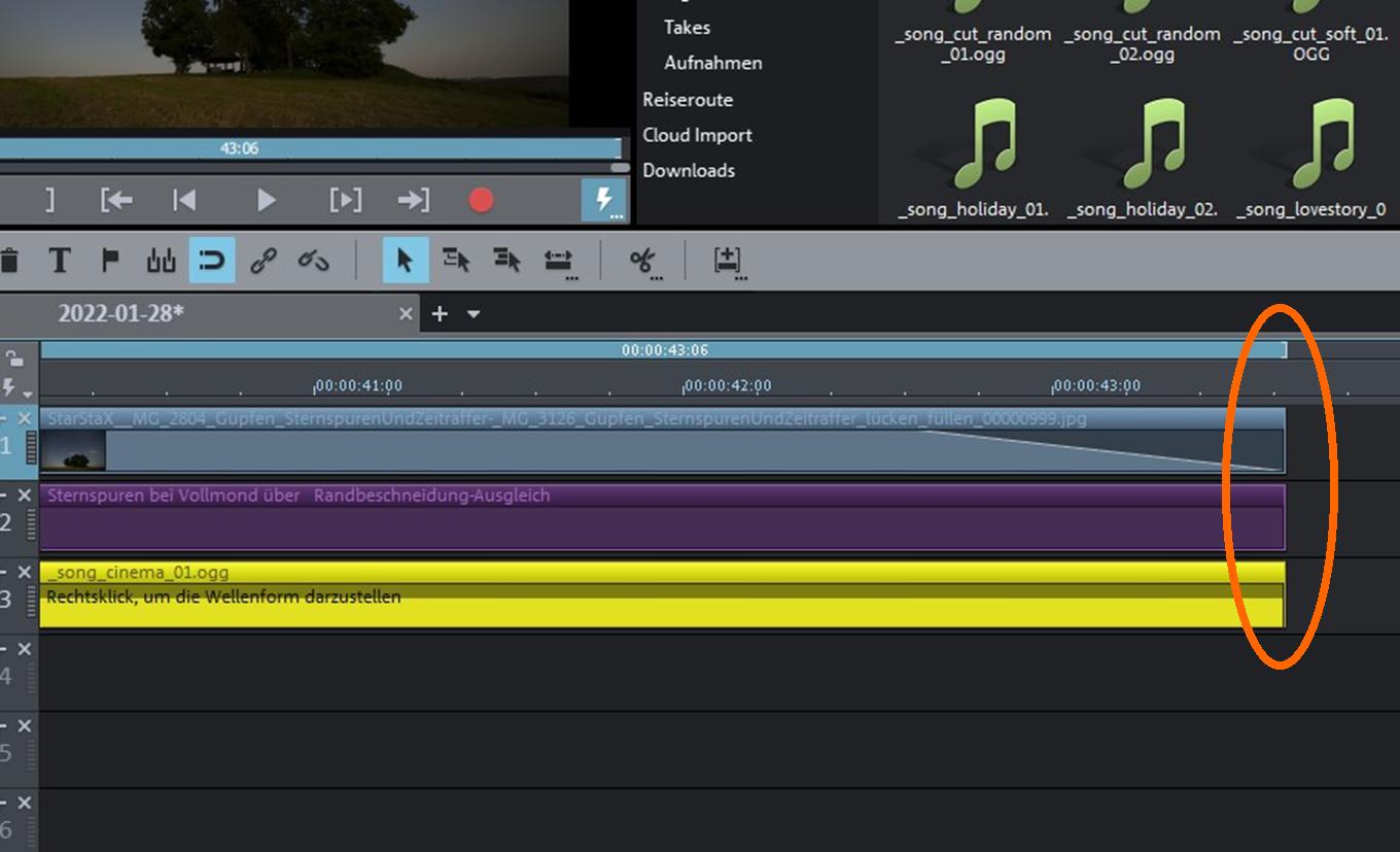 Ist das Musikstück zu lang, muss es ggf. an die Länge des Videos angepasst/gekürzt werden. Ist es zu kurz, kann zum Ausgleich ein weiterer Song importiert werden.