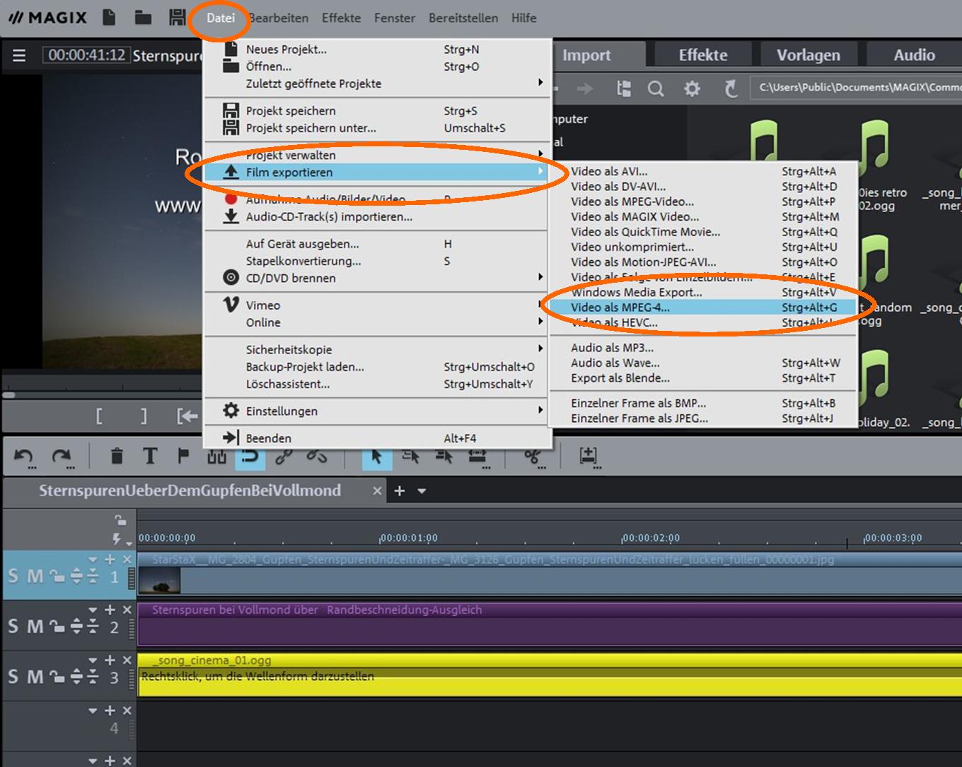 Das Zeitraffer-Video mit Magix Video deLuxe ist aber erst dann fertig, wenn es als Film exportiert wird. Dazu sind die Menüpunkte „Datei“, „Film exportieren“ und z.B. „Video als MPEG-4“ aufzurufen. MPEG-4 nutze ich für die Veröffentlichung auf YouTube.