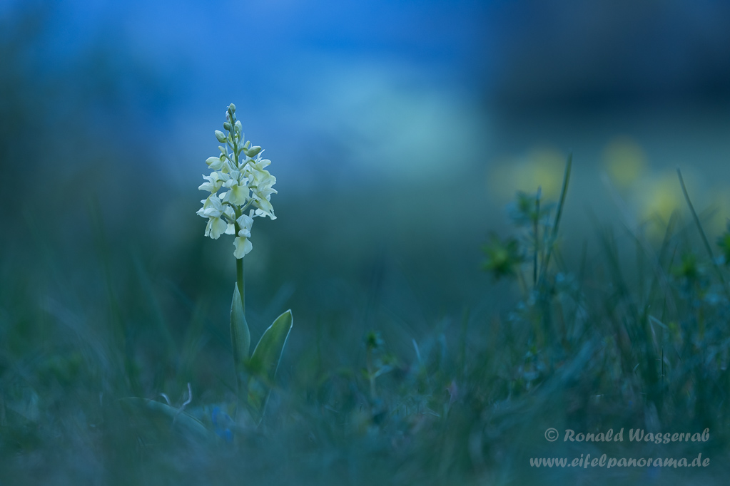 Damit das Blasse Knabenkraut (Orchis pallens) ein wenig Farbe bekommt, übernehmen Klaus und ich Florians Technik: Er stellt die Farbtemperatur seiner Kamera auf Kunstlicht, was einen kräftigen Blaustich zur Folge hat. Natürlich ist das Geschmackssache. Wir nennen unsere Kunstwerke jedenfalls: „Orchis pallens en Bleu du Florian“.