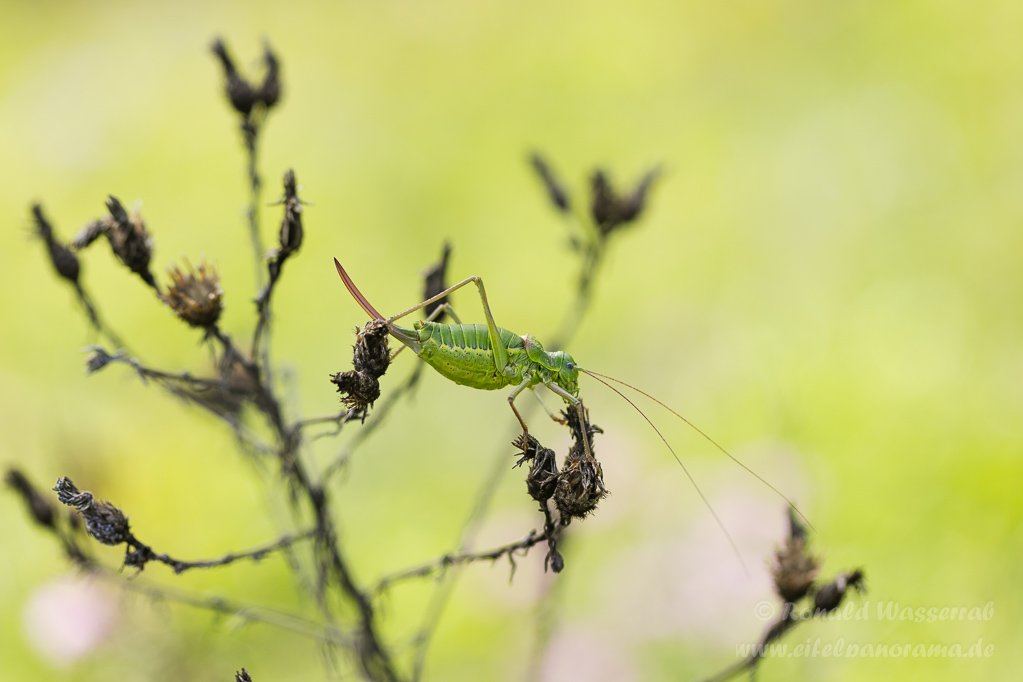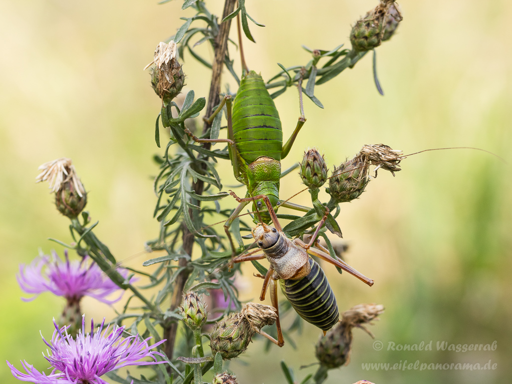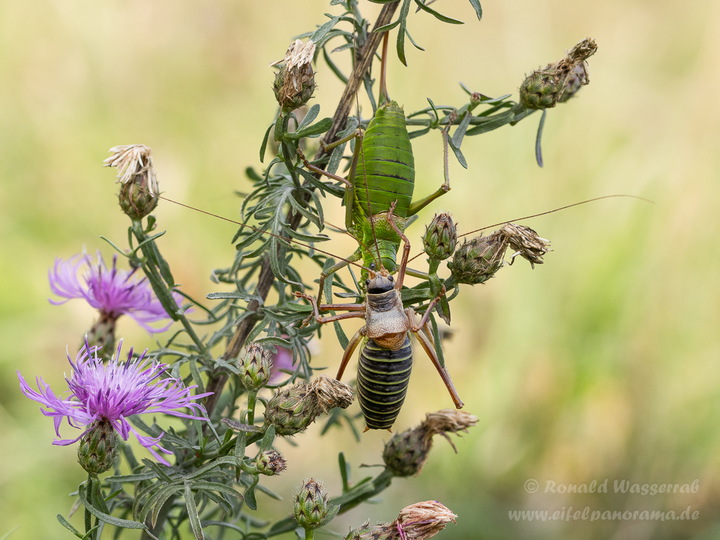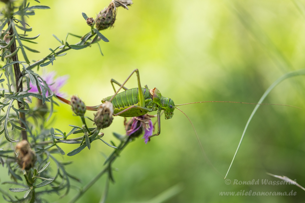 Es ist bereits nach 14 Uhr, als Michel das erste Exemplar der überaus seltenen Sattelschrecke findet. Es ist ein Weibchen, wie wir an der großen Legeröhre am Hinterleib erkennen können.