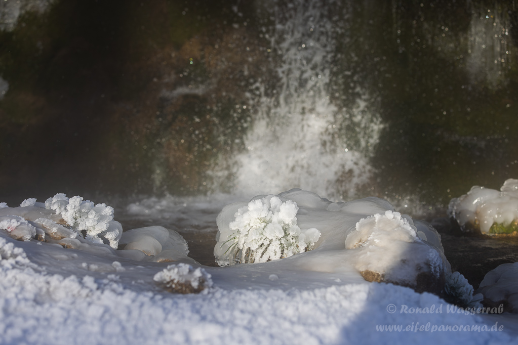 Ein kleiner Bach fließt von oben über einen Felsen und stürzt über Fels und Moosteppiche hinunter zum Talboden, um dann im nahen Ahbach zu münden. Die kalten Temperaturen der letzten Tage haben zahlreiche Eiszapfen und andere Eisgebilde am Felsen wachsen lassen.