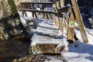 Der vereiste Steg am Dreimühlen-Wasserfall