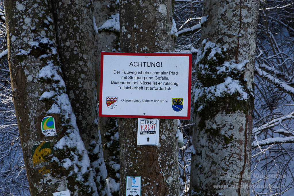 Um kurz nach 3 Uhr fällt mein Entschluss: Die bisherige Belichtungszeit für die heutigen Astroaufnahmen muss reichen. Also zum Wasserfall! Ich packe mein Astro-Equipment ein und verstaue es notdürftig. Um 4 Uhr liege ich im Bett. Um 6 Uhr stehe ich schon wieder auf und mache meine Fotosachen und mich fertig für die ca. 80 km weite Fahrt Richtung Nohn. Um sieben Uhr fahre ich von zu Hause ab, gegen 8:30 Uhr bin ich am Wasserfall. Der Fußmarsch vom Parkplatz an der Nohner Mühle zum Wasserfall ist anstrengend, denn die schmalen Pfade haben kurze, steile An- und Abstiege. Und die sind durch den festgetrampelten Schnee gefährlich glatt.
