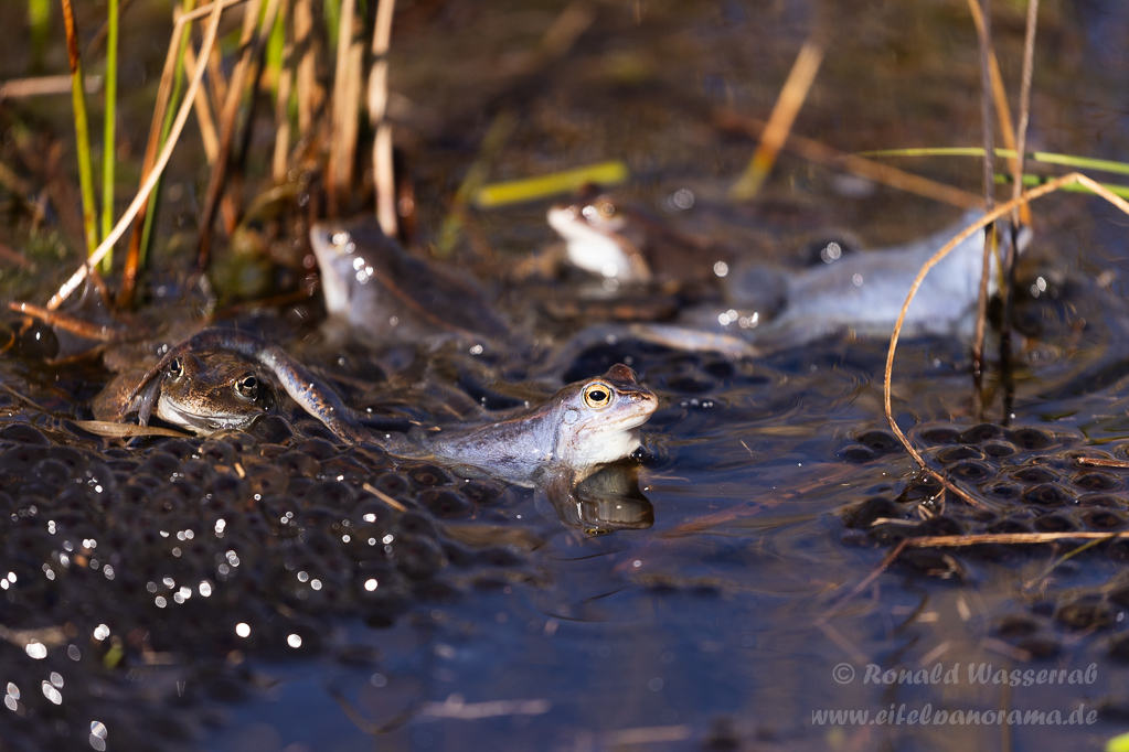 Endlich, am 19. März, habe ich Glück! Obwohl keine Meldung zu sehen ist, sind die Frösche da. Ich höre das typische „Blubb“ der Moorfrösche. Ein paar Belegfotos, dann informiere ich Peter und Florian, der sich am nächsten Morgen um 4 Uhr auf den Weg von Frankreich zu mir macht.